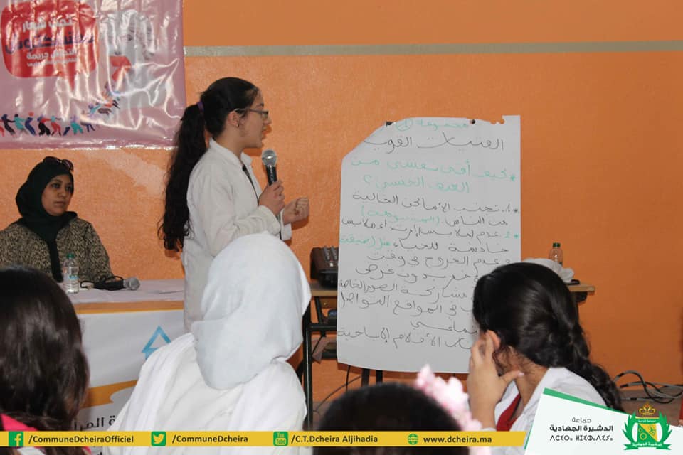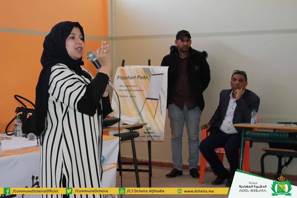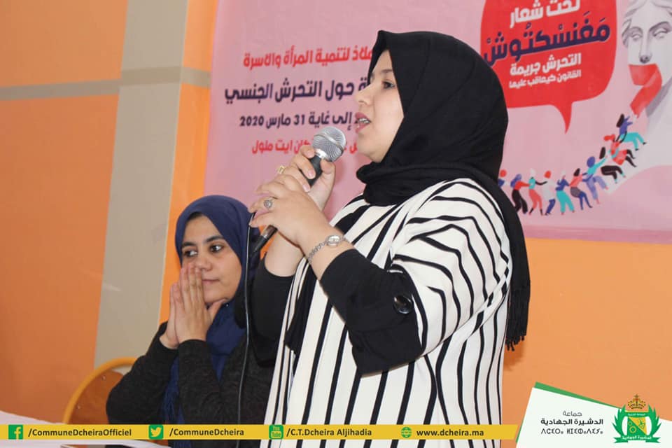وتم تقديم عرض حول العنف وأشكاله وصور التحرش، من طرف مديرة مركز تأهيل النساء في وضعية صعبة بالدشيرة الجهادية الأستاذة مريم عياش.