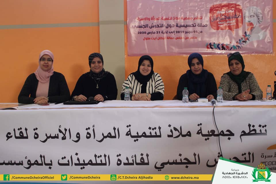 تحت شعار “مغنسكتوش؛ التحرش جريمة؛ القانون كيعاقب عليها” نظمت جمعية ملاذ لتنمية المرأة والأسرة بدعم من مجلس عمالة انزكان ايت ملول، يومه الخميس 6 فبراير الجاري، برحاب الثانوية الاعدادية البوشواريين، حملة تحسيسية حول التحرش الجنسي لفائدة تلميذات الثانوية.