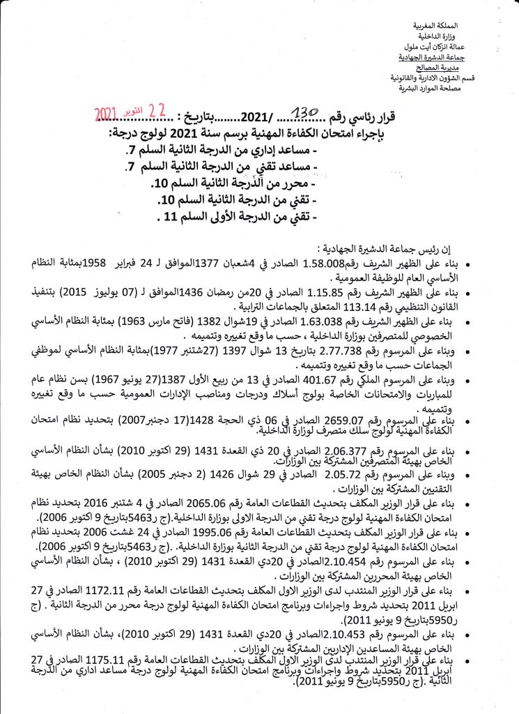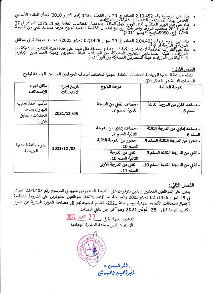 اعلان تنظيم امتحانات الكفاءة المهنية لفائدة الأطر والموظفين التابعين لجماعة الدشيرة الجهادية.