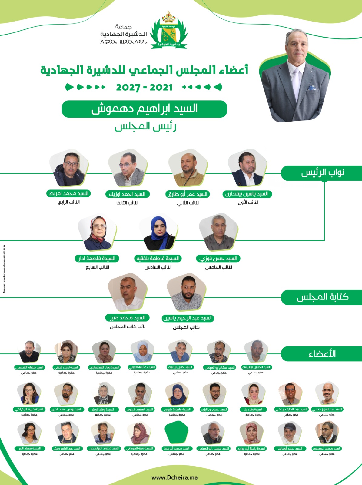 جماعة الدشيرة الجهادية مؤسسة خدماتية تعنى بشؤون تقديم الخدمات الأساسية للمواطنين بالدرجة الأولى بواسطة مجلس تداولي، وهي تسعى باستمرار